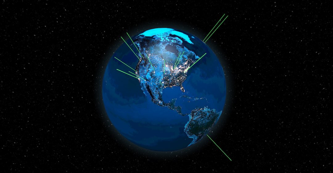 Interactive globe showing real-time visitor traffic on www.legal.io, made using three.js.